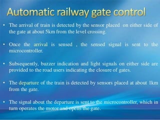 This project report describes a wireless automatic railway gate controlling system that uses sensors and a microcontroller to open and close railway gates automatically. The system aims to reduce accidents by providing reliable automatic operation of gates without human errors, and to reduce the time taken to open and close gates. Key elements include motion sensors to detect approaching trains, an IR circuit, and a microcontroller to control the automatic operation of the railway gates.