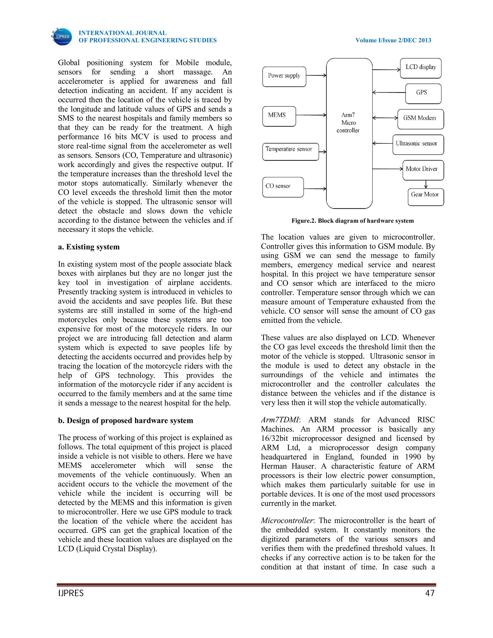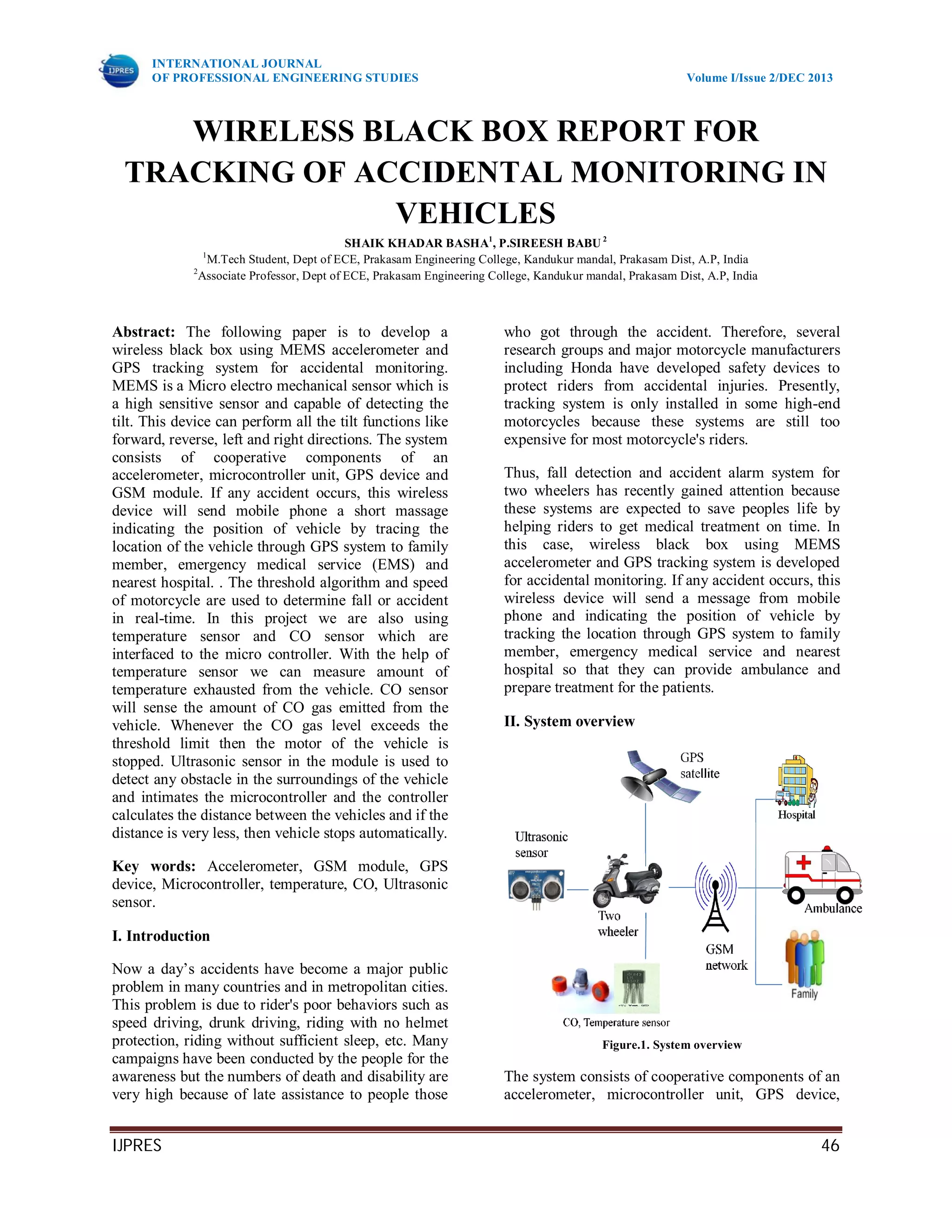 The document discusses the development of a wireless black box for accidental monitoring in vehicles, utilizing MEMS accelerometers and GPS technology. This system detects accidents, tracks the vehicle's location, and sends alerts to family members and emergency services to ensure prompt medical assistance. Additionally, it incorporates sensors for monitoring vehicle emissions and obstacles, enhancing overall safety for riders.