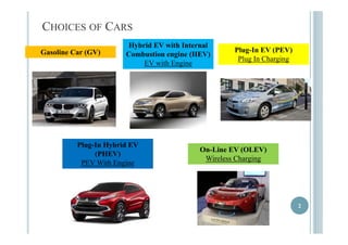 The document discusses wireless charging for electric vehicles (EVs), covering various types of EVs, current technology, market selection, and business models. It highlights the advantages of wireless charging, such as reduced battery size, increased efficiency, and the potential for continuous charging, while also addressing infrastructure costs and strategic controls. The aim is to position the service provider as a leading entity in the EV charging ecosystem through partnerships and government support.
