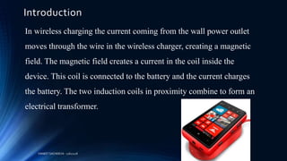 Wireless charging works by using magnetic induction to transfer energy between two coils. When electricity flows through a charging coil, it creates a magnetic field that induces a current in a receiving coil connected to a device battery. Early experiments with wireless power transmission date back to Nikola Tesla in 1901, while more recent research by MIT in 2007 demonstrated wireless charging over distances of a few meters. Wireless charging technologies include magnetic induction, resonance charging, radio frequency and optical charging, enabling convenient charging of devices without cables.