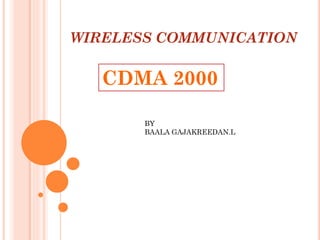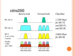 CDMA2000 is an evolution of CDMA technology that provides higher data rates and improved voice quality over CDMA. It spreads signals across a wider bandwidth and uses techniques like multicarrier modulation to support higher data rates. CDMA2000 represents a family of standards that offer both voice and high-speed data services. It provides more efficient use of spectrum and supports advanced mobile services while maintaining backward compatibility.