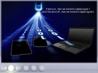 Wireless communication allows transfer of information between two or more points without wires. Common forms of wireless communication include Bluetooth, NFC, WiFi, and LiFi. Bluetooth uses short-range radio links to connect devices like headphones, keyboards and printers. It transmits data via low-power radio waves at a frequency of 2.45 gigahertz and can connect up to eight devices simultaneously. NFC operates at a very short range through electromagnetic induction, allowing data exchange when devices are touched or in close proximity. It is commonly used for contactless payments and data sharing. WiFi enables internet access from any location within range of a base station using radio waves, providing cable-like speeds wirelessly. LiFi is a wireless optical