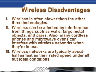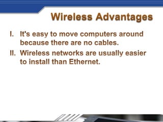 Wireless networks allow devices to connect to the Internet and each other without cables by using radio signals. Setting up a wireless network involves getting a broadband Internet connection, a wireless router, and wireless network adapters for devices if needed. The router sends information between the network and Internet via radio signals instead of wires. It's recommended to use an 802.11g wireless router for a fast and strong wireless signal. Additional steps include installing any necessary wireless adapters into devices.