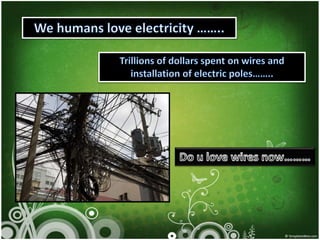 Witricity is a technology that transfers electric power wirelessly through electromagnetic induction. It was first proposed in 1891 by Nikola Tesla but failed to gain traction until researchers at MIT successfully transmitted power wirelessly over short distances in 2007. There are three main types of wireless power transfer: inductive coupling for short ranges; resonant inductive coupling for mid ranges; and microwave transmission for long ranges. Witricity has applications for powering devices, charging electric vehicles, and industrial uses where wires present safety hazards. While it promises more convenient power delivery, challenges remain in standardizing frequencies, reducing power losses over distance, and addressing health and safety concerns with long range microwave transmission.