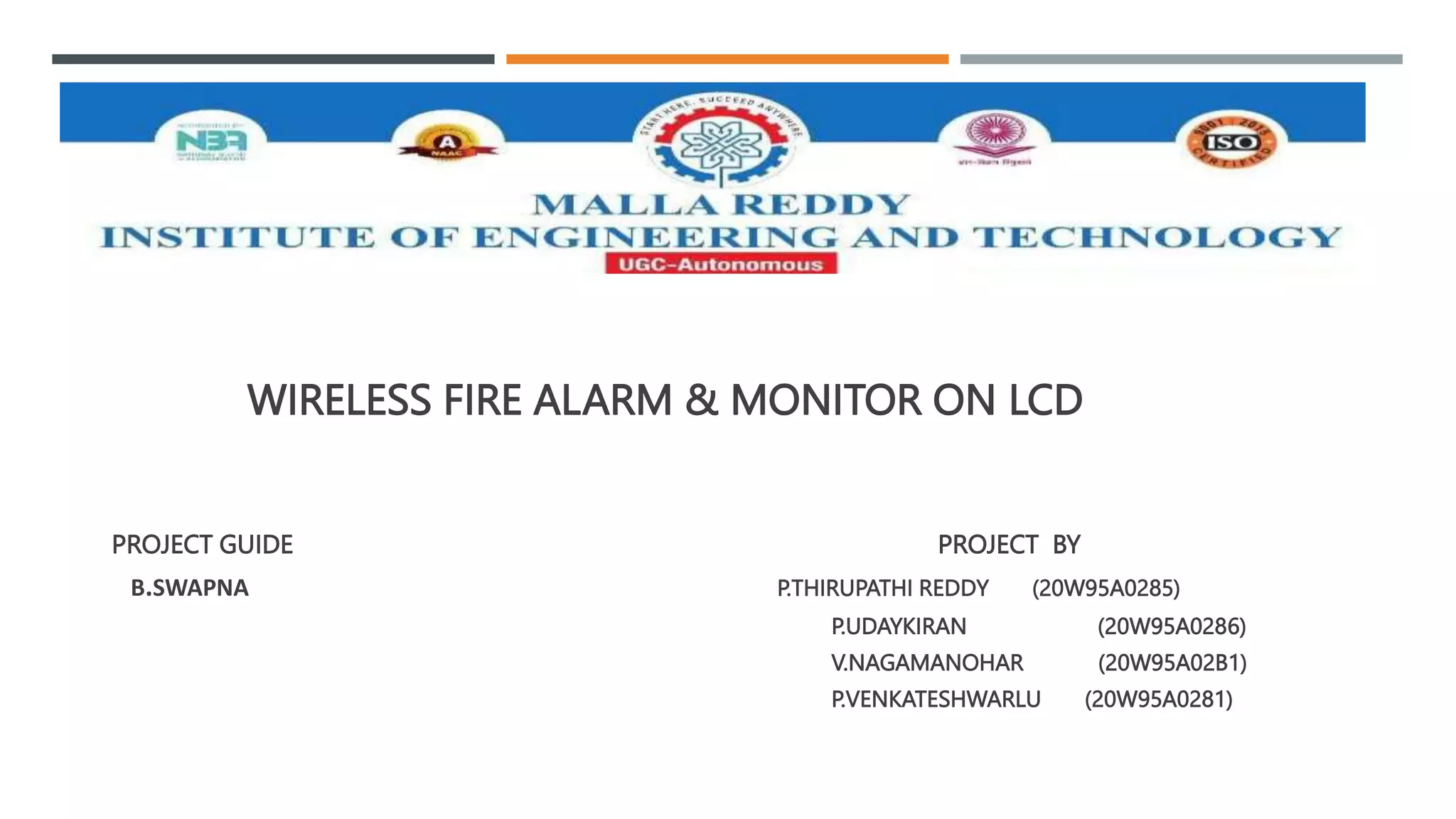This document describes a wireless fire alarm and monitoring system that uses sensors to detect fires and alert people. The system uses a fire sensor connected to a microcontroller that monitors temperature and transmits a signal if a fire is detected. An RF receiver receives the signal and decodes it, then the microcontroller displays a message on an LCD and sounds a buzzer to alert people. The system aims to detect fires early to prevent threats and reduce losses in homes and industries. It provides benefits like reduced wiring and costs, real-time monitoring, and easy maintenance compared to wired systems.