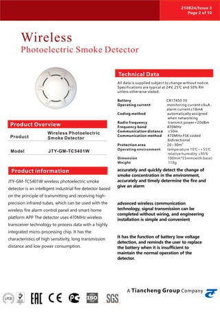 The document describes the JB-TB-TC5126W wireless fire alarm control panel and its various components, including smoke detectors, heat detectors, and manual call points, which utilize advanced wireless communication technology for efficient operation in fire safety applications. Each device features compact design, high sensitivity, and the ability to detect and communicate alarms without wired connections, making installation easier. The entire system is suitable for various environments such as offices, residential buildings, and hotels, offering reliable operation and real-time monitoring capabilities.