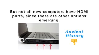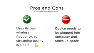 Wireless HDMI technology allows users to transmit high-definition video and audio from one device to another without cables. There are two main methods: using wireless HDMI transmitters that plug into devices, or using apps where a transmitter plugs into the TV and the app streams from other devices. While convenient, wireless HDMI using apps relies on WiFi which can be unstable. For wireless HDMI to succeed in replacing cables, it needs to be cross-platform, compact, and user-friendly.