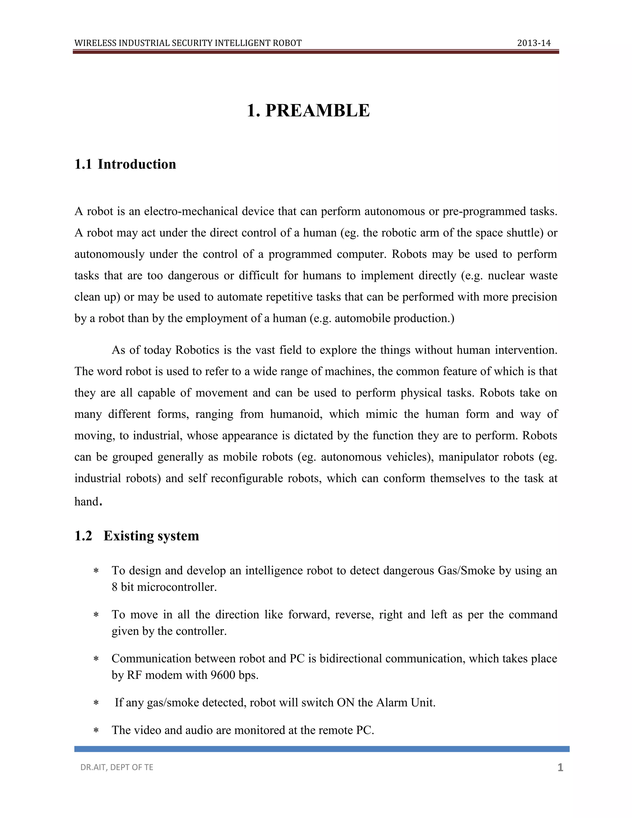 This document describes a proposed wireless industrial security robot. The robot is designed to move autonomously into unknown locations using sensors and cameras to gather information. It contains modules like an ARM microcontroller, gas sensor, fire sensor, Zigbee transceiver, GSM modem, sonar, camera, temperature sensor, and humidity sensor. The robot part sends sensor data and video to a remote PC part via Zigbee. If abnormal conditions like fire or gas are detected, an alert SMS will be sent via the GSM modem. The remote PC can monitor sensor readings and video, and control the robot's movement via Zigbee. The goal is to design an intelligent robot that can detect hazards, alert users, and