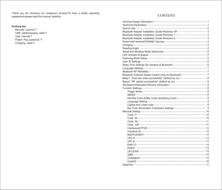 The document is a user manual for the v.d1508 wireless laser barcode scanner, detailing its housing design, technical parameters, and usage instructions for both wired and wireless modes. It provides comprehensive guidelines on Bluetooth adapter installation for Windows, Android, iOS, and Mac devices, as well as various scanning modes, function settings, and the charging process. Additionally, it includes troubleshooting tips and configuration settings for optimal performance.