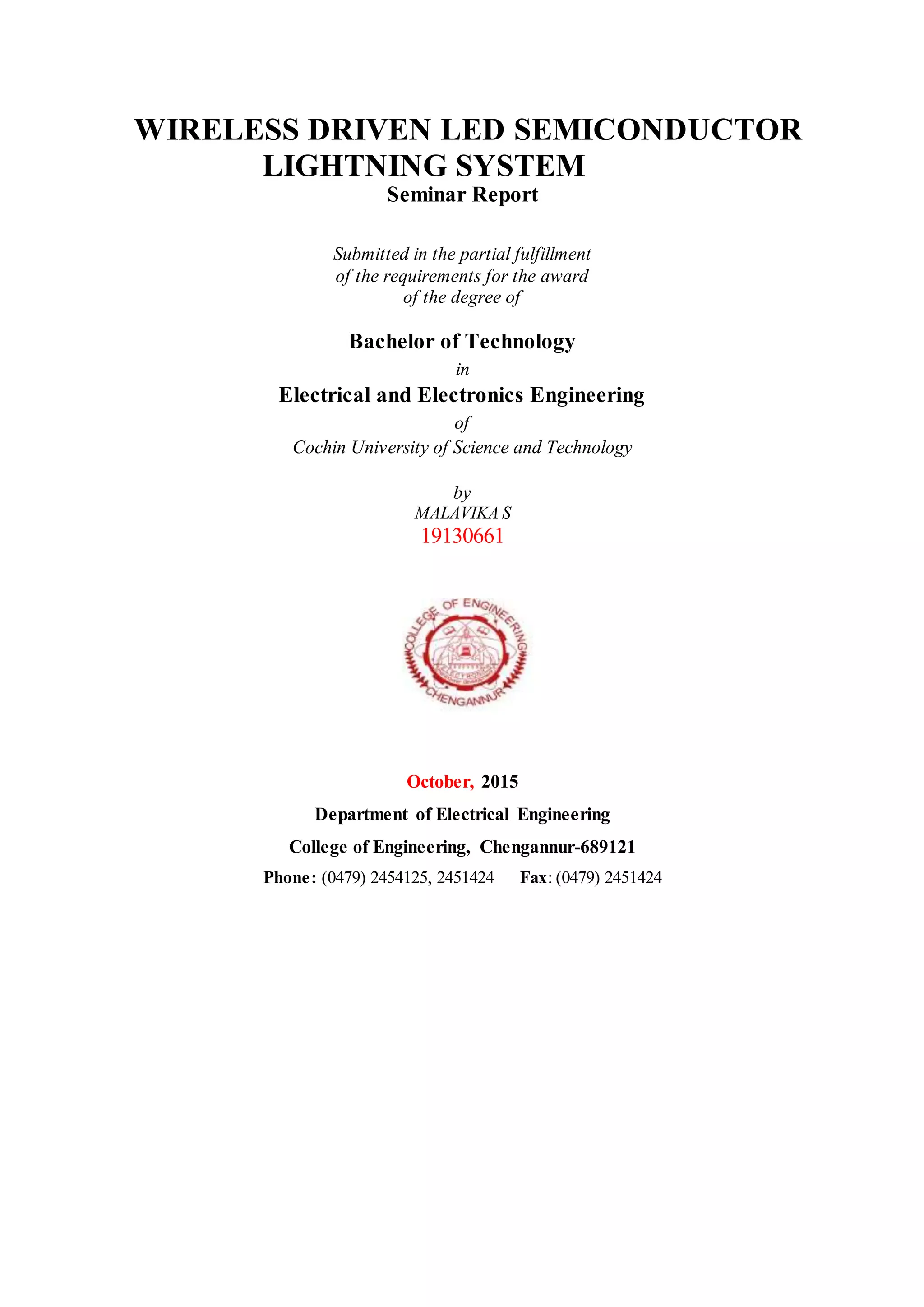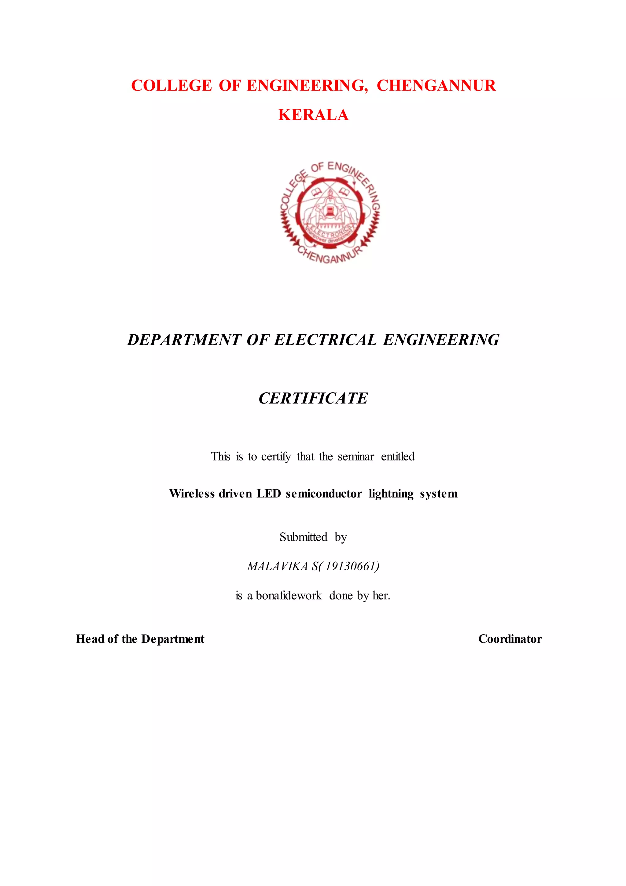 This document is a certificate certifying that Malavika S completed a seminar presentation entitled "Wireless driven LED semiconductor lightning system". It includes an abstract summarizing her seminar report, which proposed a wireless power transfer system to drive LED lighting. The system would contain an LED lighting module, wireless power transfer system using either inductive or magnetic resonance coupling, an LED driving circuit, and an energy storage system. The report discussed the history and principles of wireless power transfer technologies.