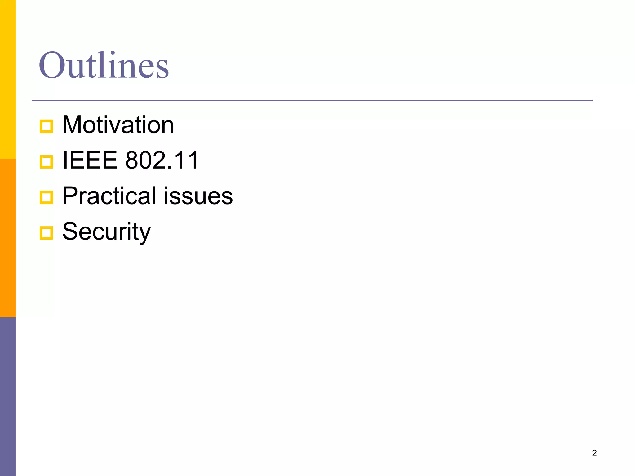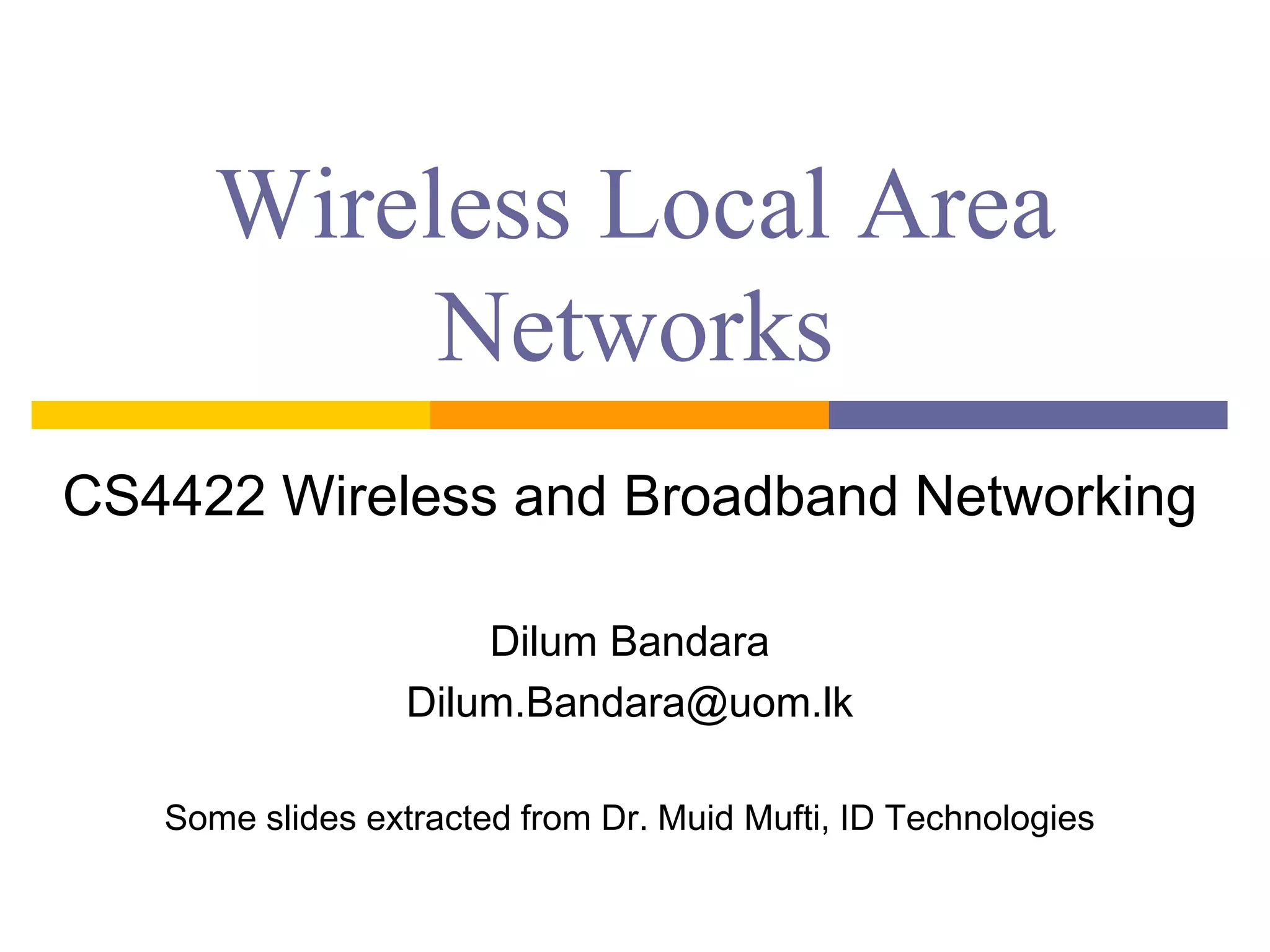 The document discusses wireless local area networks (WLANs) including their motivations, IEEE 802.11 standards, and practical issues such as security concerns and network planning. It provides an overview of WLAN components, topologies, and wireless communication protocols, as well as various versions of the IEEE 802.11 standard and their characteristics. Additionally, it addresses challenges like data speed, interference, and roaming, emphasizing the importance of effective planning and implementation for optimal performance.