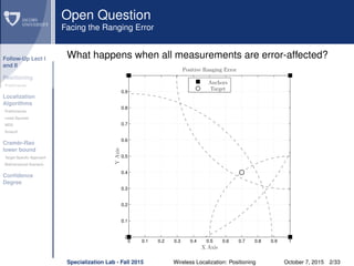 The document discusses wireless localization techniques focusing on positioning algorithms and the impacts of ranging error on target estimation accuracy. It highlights methods such as least squares, multidimensional scaling, and emphasizes the challenges arising from errors in distance measurements. The presentation also covers network types, algorithms for solving nonlinear systems, and a theoretical foundation for enhanced localization strategies.