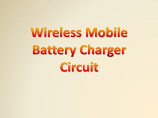 This document describes a simple wireless battery charger circuit that charges mobile phones wirelessly using inductive coupling. The circuit works by using an oscillator circuit in the transmitter coil to induce an alternating current in a nearby receiver coil placed under a mobile phone. This induced current is then rectified and regulated to charge the phone battery without needing a physical connection. The circuit provides wireless power transfer using mutual inductance between the transmitter and receiver coils based on induced magnetic fields.