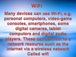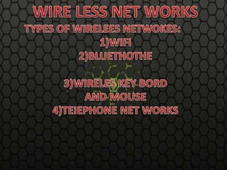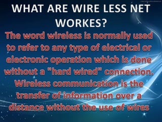 An ad hoc network connects two or more devices directly without a wireless access point for quick data exchanges or multiplayer gaming. Cordless mice transmit data via infrared radiation or radio signals to a receiver connected to the computer via USB or built-in. Wireless keyboards use either infrared light waves or radio frequencies from 27MHz to 2.4GHz to communicate with devices, with most modern keyboards using 2.4GHz radio signals.