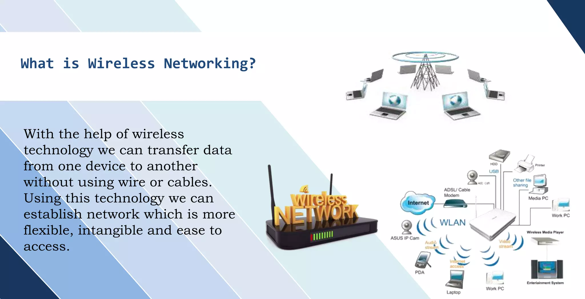 This document discusses wireless networking. It defines wireless networking as transferring data between devices without wires or cables using technologies like radio transmission. It describes the components needed for a wireless network like antennas and wireless adapters. It categorizes wireless networks into LANs, MANs, WANs and PANs based on their size and range. It also discusses security options and standards for wireless networks like WEP, WPA, and WPA2. Finally, it outlines advantages like improved access and mobility and disadvantages like potential security issues and fluctuating transmission speeds.