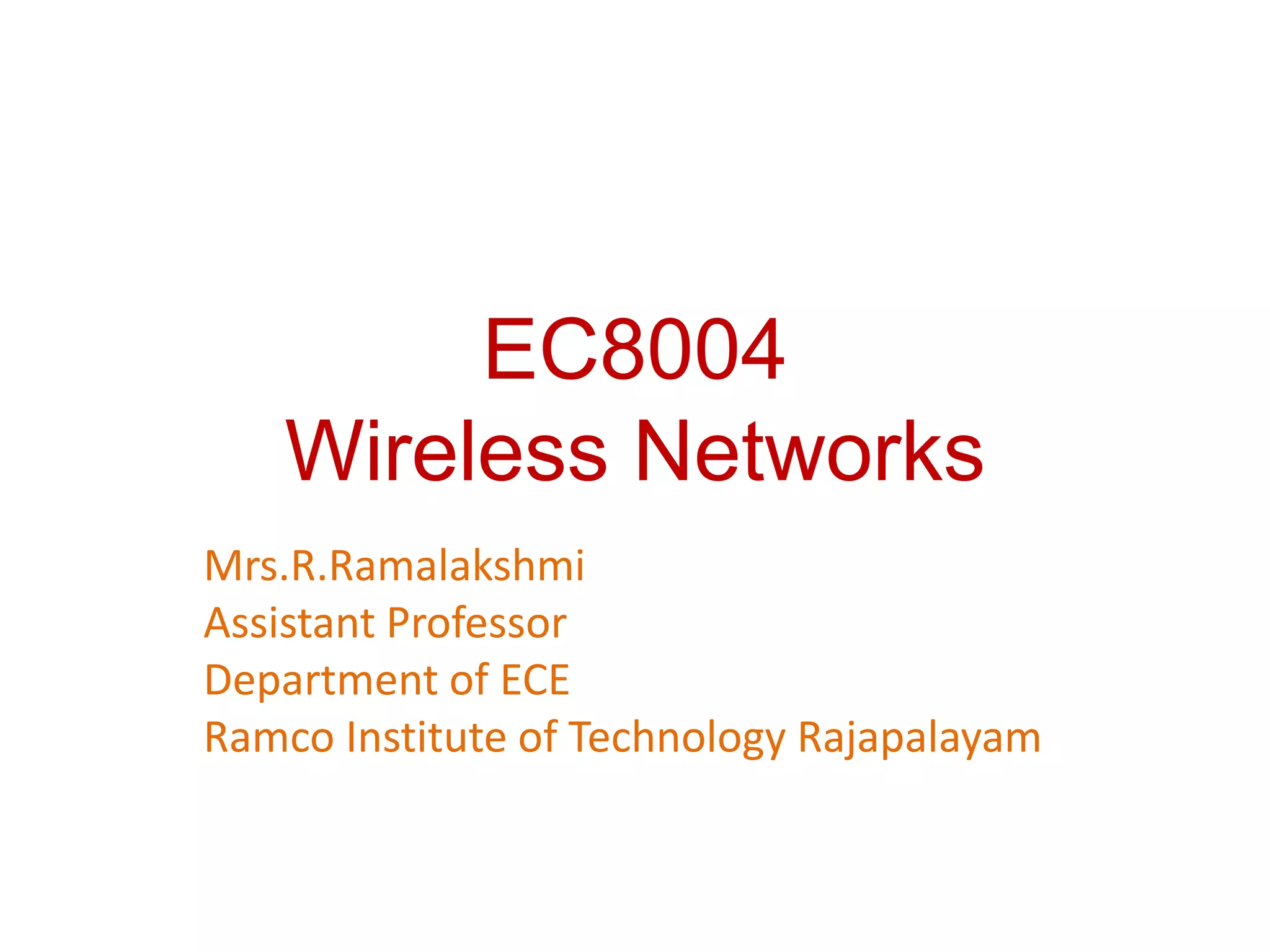 This document provides information about the EC8004 Wireless Networks course taught by Mrs. R. Ramalakshmi at Ramco Institute of Technology Rajapalayam. The course objectives are to understand wireless networks concepts, analyze network layer solutions, study 3G services and protocols, and explore the evolution of 4G networks. The syllabus covers topics like wireless LAN technologies, mobile network layer, 3G overview, internetworking between WLANs and WWANs, and 4G technologies. An introduction to wireless networks discusses their history, electromagnetic spectrum, wireless technologies like Bluetooth and WiFi, and India's national frequency allocation plan.