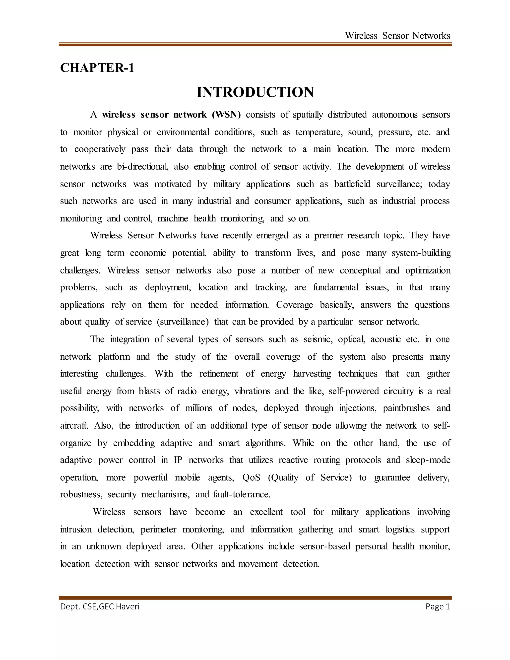 The document discusses wireless sensor networks (WSNs). It describes WSNs as consisting of distributed sensors that monitor conditions like temperature, sound, and pressure and transmit data to a central location. Modern networks are bidirectional, enabling sensor control. WSNs were initially developed for military surveillance but are now used in industrial and consumer applications. They pose challenges in deployment, location tracking, coverage, and integration of different sensor types on a single platform. Advances in energy harvesting and self-organizing networks could enable millions of low-cost sensor nodes. WSNs have applications in intrusion detection, health monitoring, and location detection.