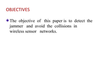 This document presents optimal jamming attack strategies in wireless sensor networks. It discusses using monitoring nodes to detect jammer attacks and putting sensor nodes in sleep mode when attacks are detected to avoid energy loss. The document outlines different types of attacks in wireless sensor networks including passive and active attacks. It proposes using a detection algorithm at monitoring nodes to analyze observations and decide if an attack is occurring. The goal is to study controllable jamming attacks that are difficult to detect and defend against.