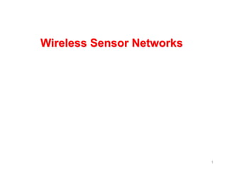 This document provides an overview of wireless sensor networks, including their applications in various fields such as military, environment, health, home, and automotive. It discusses the key factors influencing sensor network design such as fault tolerance, scalability, and power consumption. It also describes the typical components of sensor nodes, communication architectures, operating systems like TinyOS, and simulators used for wireless sensor networks.