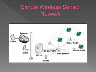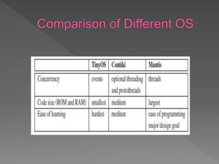 This document discusses system architecture and operating systems for wireless sensor networks and embedded devices. It defines system architecture as the structure and organization of a computing system consisting of hardware and software modules that enable data exchange. It then describes several operating systems used for wireless sensor networks and embedded devices, including TinyOS, Contiki, Mantis, Windows CE, eCos, QNX, and XMK. It explains key aspects of each operating system such as scheduling, concurrency, programming models, and dynamic reprogramming capabilities.