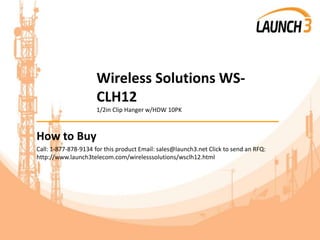 This document provides information about the Wireless Solutions WS-CLH12 1/2in Clip Hanger including how to purchase, payment options, shipping details, and warranty. It also describes additional services provided by Launch 3 Telecom such as repairs, maintenance contracts, de-installation, and telecom equipment recycling.
