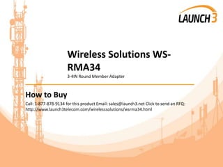 This document provides information about the Wireless Solutions WS-RMA34 3-4IN Round Member Adapter. It can be purchased from Launch 3 Telecom for $1.00 by phone, email, or online request form. Launch 3 Telecom offers same day shipping once an order is placed and provides a warranty on all products. Additional services offered include repair, maintenance contracts, de-installation, equipment storage, and more.