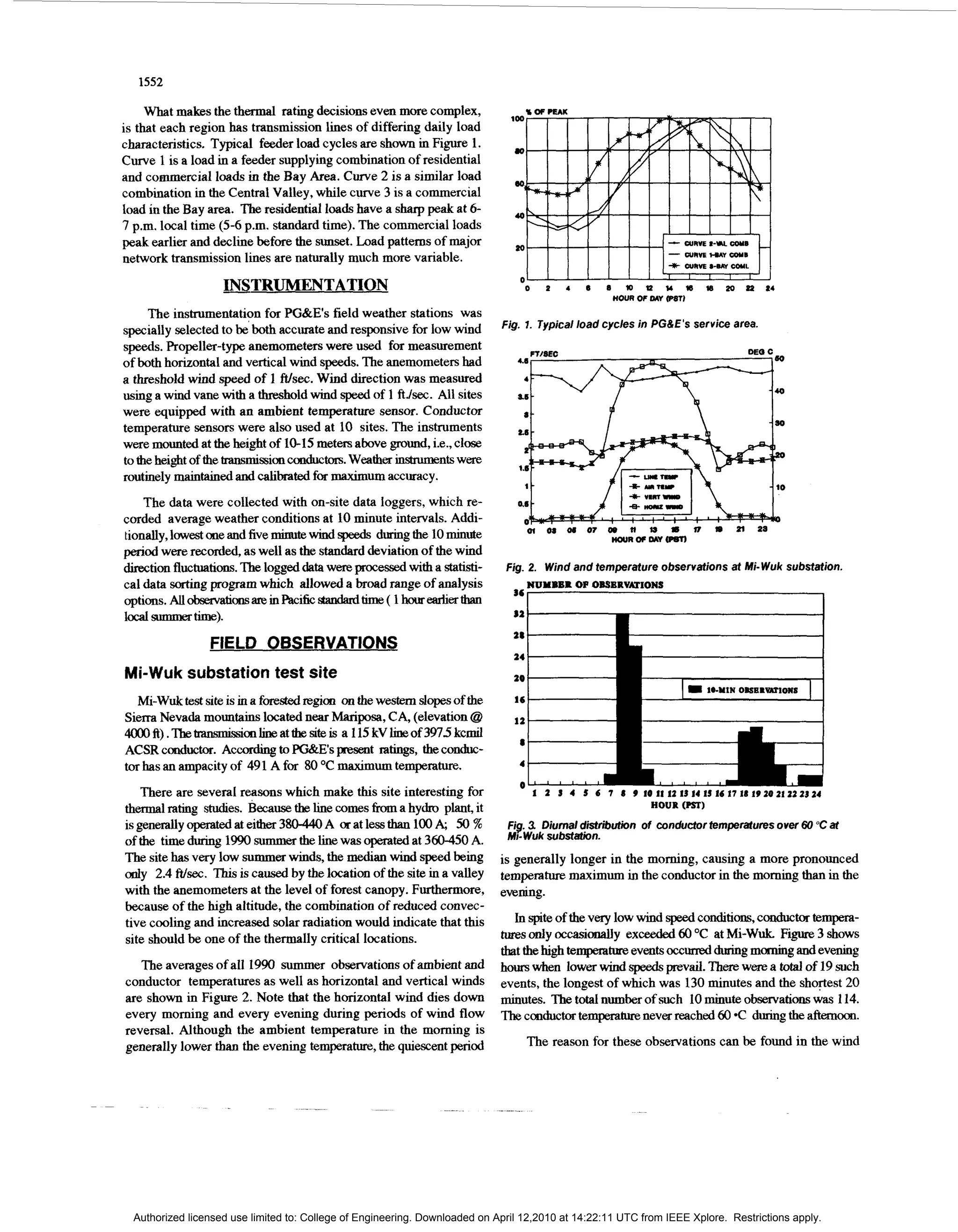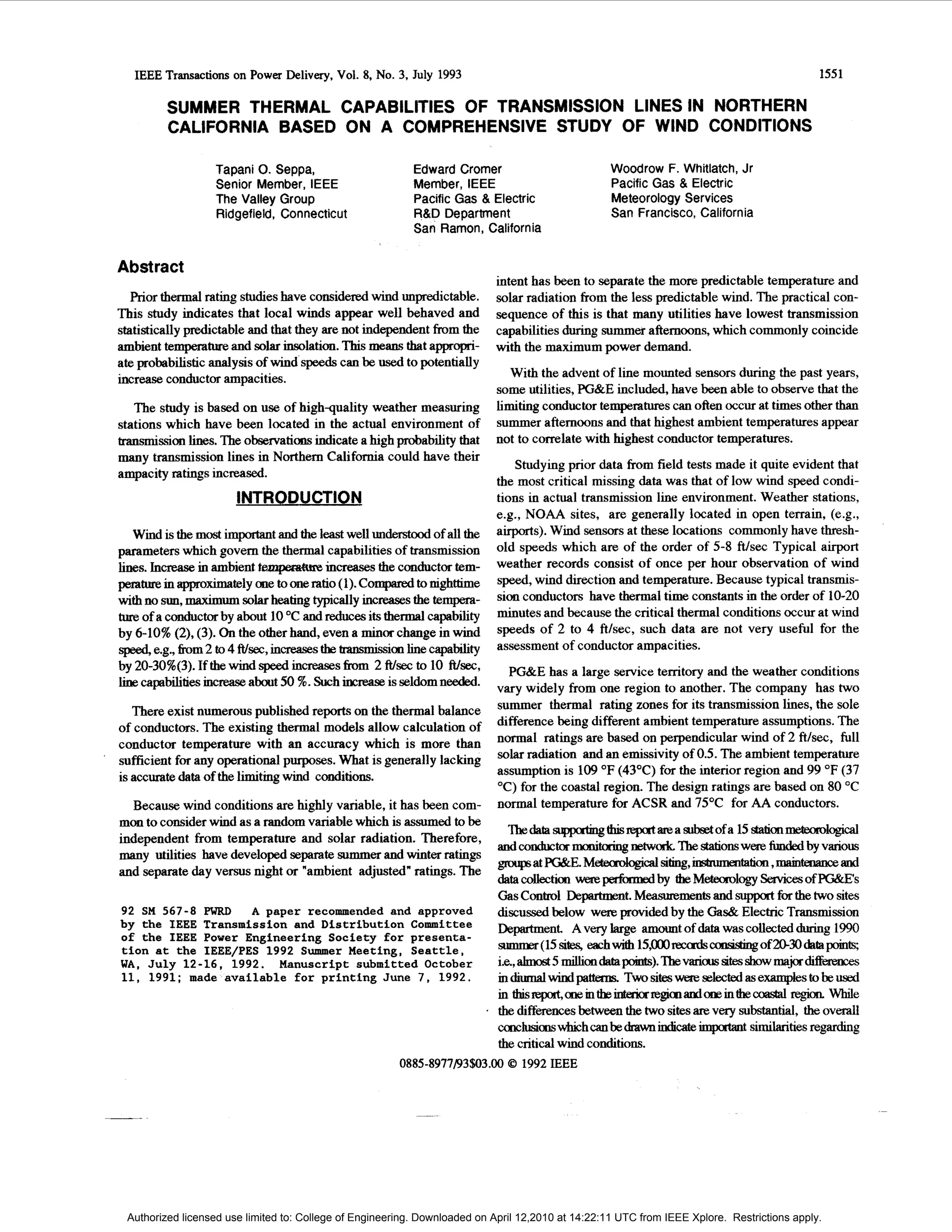 This document summarizes a study of wind conditions and their impact on transmission line ratings in Northern California. The study found that local winds are statistically predictable and not independent of temperature and solar radiation. This means transmission line ratings could potentially be increased through probabilistic wind analysis. The study was based on high-quality weather data collected from sensors placed near transmission lines, which found a high probability that many line ratings in Northern California could be raised.
