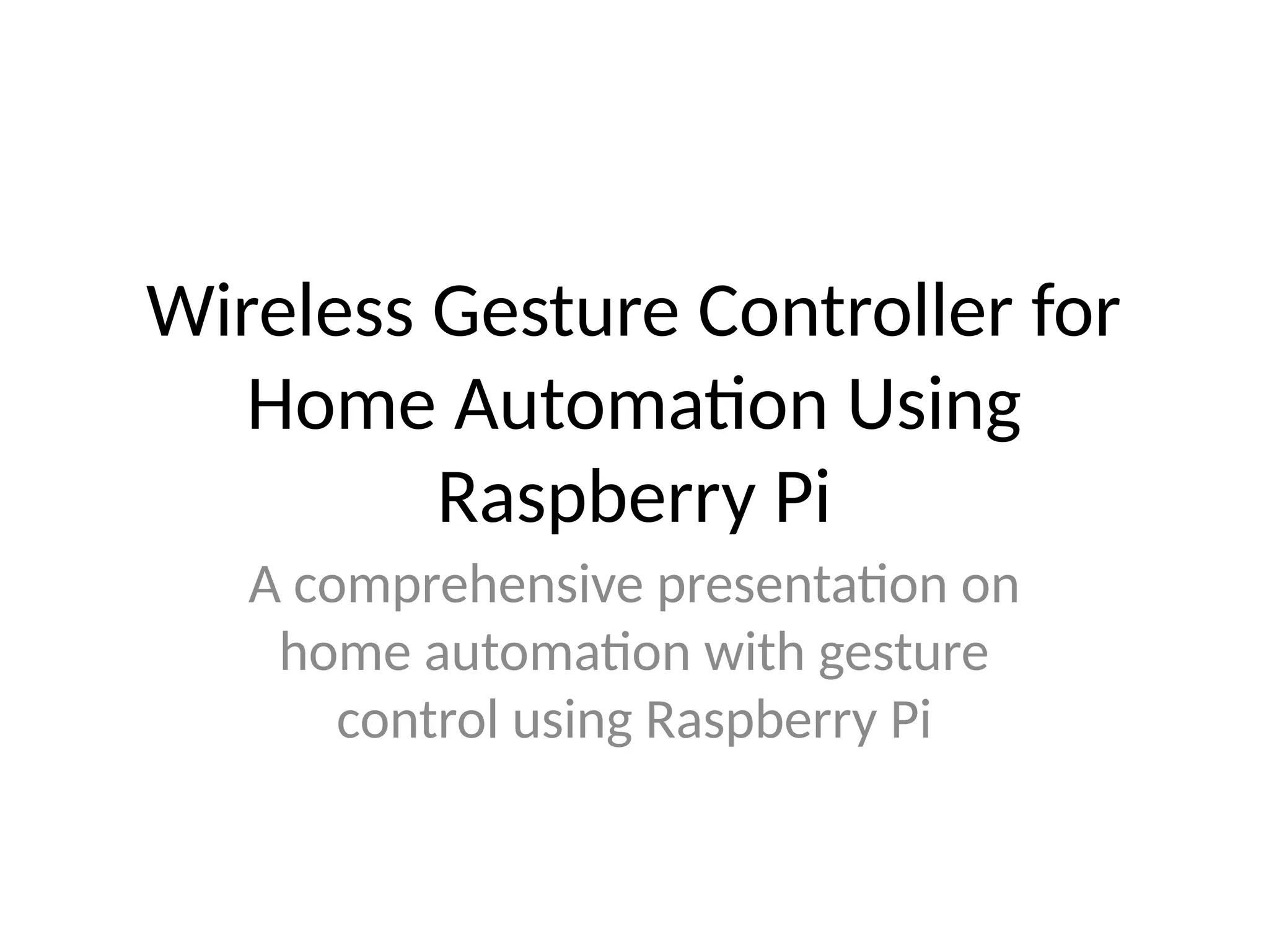 The document presents a wireless gesture controller for home automation utilizing Raspberry Pi, aimed at enhancing convenience and efficiency through contactless control of appliances. It outlines the system's components, design, and operation, emphasizing its advantages such as accessibility and energy efficiency, while also noting challenges like gesture recognition accuracy. Future enhancements include voice control integration and machine learning for improved functionality.