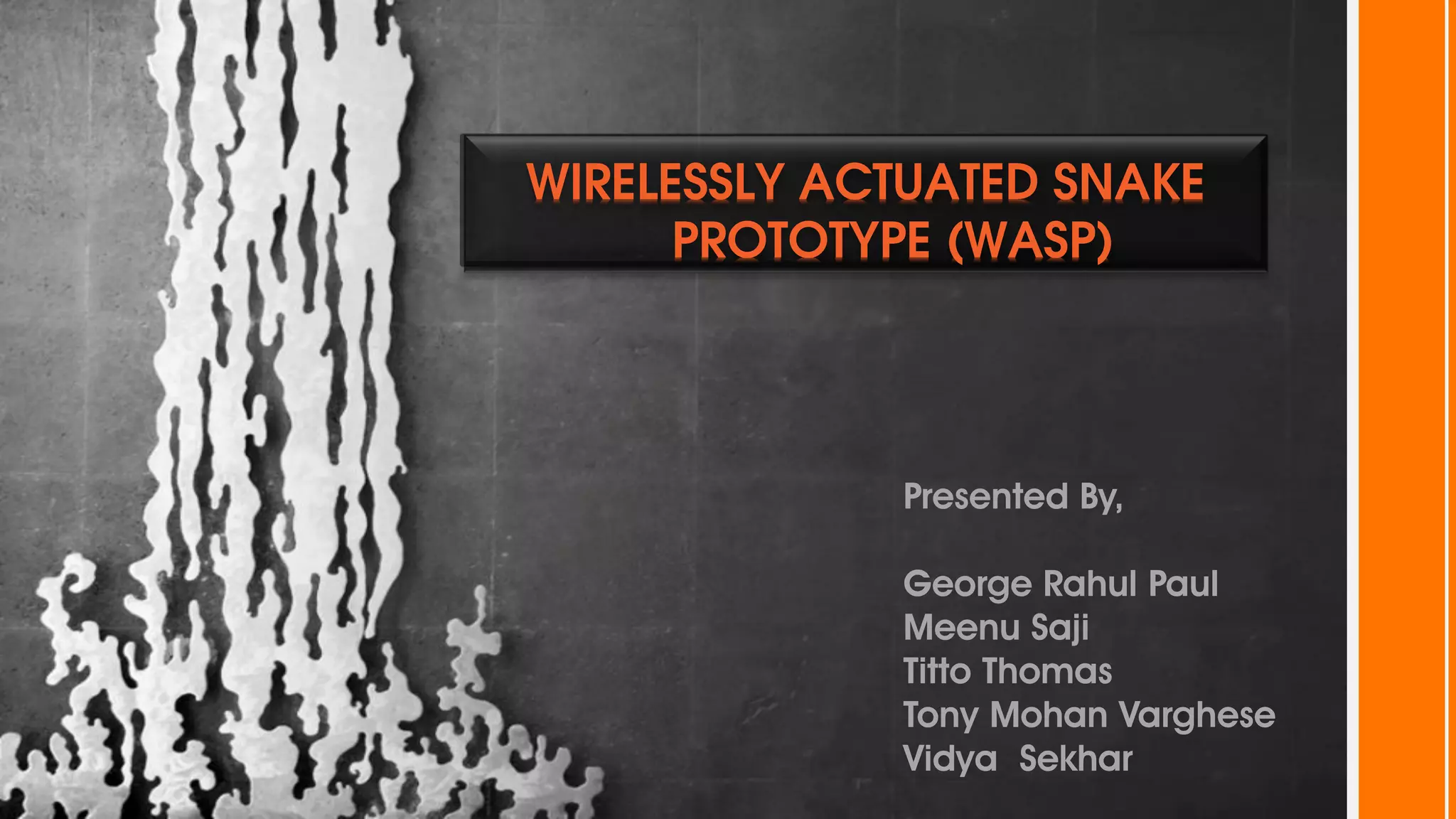 This document describes a wireless snake robot prototype called WASP. It has 8 linked segments that provide multiple degrees of freedom for flexible motion. The robot is intended to demonstrate horizontal and basic vertical movement as a proof of concept. Key components include a microcontroller for motion control, sensors for environmental analysis, and wireless communication between the robot and a PC interface. Algorithms are used to generate servo motor angles from user instructions to achieve the snake-like locomotion. The prototype aims to establish wireless control, sensor data reception and basic on-field movement capabilities. Future work may include improving gaits, mechanism design, power efficiency and adding autonomous capabilities.