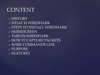Wireshark is a network packet analyzer that allows users to examine network packet data and traffic in detail. It can capture live packet data from interfaces, open saved capture files, and display packets with detailed protocol information. Network administrators, security engineers, and developers use Wireshark to troubleshoot network issues, examine security problems, and debug protocol implementations.
