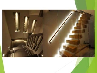 This document discusses various types of wiring accessories and lighting used in domestic and commercial wiring. It describes common accessories like switches, sockets, plugs, lamp holders and safety devices like fuses and miniature circuit breakers. It also covers different types of lighting including incandescent, fluorescent, LED lights and discusses ambient, task and accent lighting. Various fixtures like pendants, chandeliers, track lighting and lanterns are also mentioned.
