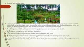 Dokumen tersebut membahas 5 objek wisata di Kabupaten Batang, Jawa Tengah yaitu Pantai Ujung Negoro yang memiliki pemandangan menarik dan makam Syekh Maulana Magribi, Kebun Teh Pagilaran yang menawarkan pemandangan kebun teh luas dan aktivitas outdoor, Forest Kopi yang menyajikan sensasi menikmati kopi di tengah hutan dan pemandangan alam, Pranten Jalan Bawang-Dieng yang memiliki pemandangan bukit dan gunung sepanjang