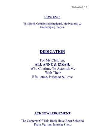 The document discusses four pillars that support the world: the learning of the wise, the justice of the great, the prayers of the righteous, and the valor of the brave. However, it notes that all of these are meaningless without a ruler who knows the art of ruling. It was compiled by U Shahid Riaz and contains inspirational stories and wisdom pearls on various topics.