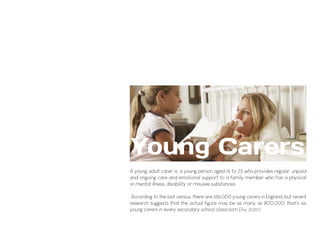 Young adult carers, aged 16 to 25, provide significant unpaid care to family members, with estimates suggesting up to 800,000 young carers in England. Many young carers face mental health challenges and overwhelming responsibilities, often missing out on typical childhood experiences due to their caring role. There is a critical need for increased awareness and support within schools and communities to address the unique struggles of young carers and provide them with the emotional and practical resources necessary for balance and well-being.