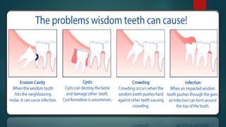 This document discusses wisdom teeth and whether their extraction is necessary. It defines wisdom teeth as the third molars that commonly become impacted due to insufficient space. Reasons for impaction include heredity factors and decreasing jaw size from modern diets. Surgical removal of impacted wisdom teeth carries risks like infection, pain, and nerve damage. While debate continues on the need to extract wisdom teeth, their impaction can lead to complications if left in place.