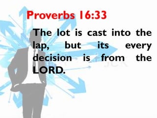This document provides guidelines for wise decision-making in a Christian family. It recommends (1) making decisions through prayer, following God's word, and seeking guidance from authorities; (2) considering family opinions with clear explanations; (3) delaying decisions if there are differing views to allow more prayer; (4) allowing the father to make the final decision; (5) supporting the final decision without complaining to maintain unity; (6) evaluating decisions regularly; and (7) adjusting decisions if not successful, as timing is important in decision-making. The overall message is to commit plans to God and trust in Him.