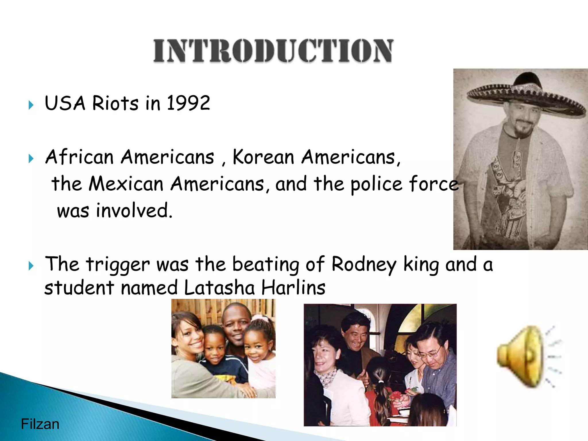 IntroductionUSA Riots in1992African Americans , Korean Americans, the Mexican Americans, and the police force was involved.The trigger was the beating of Rodney king and a student named Latasha HarlinsFilzan
