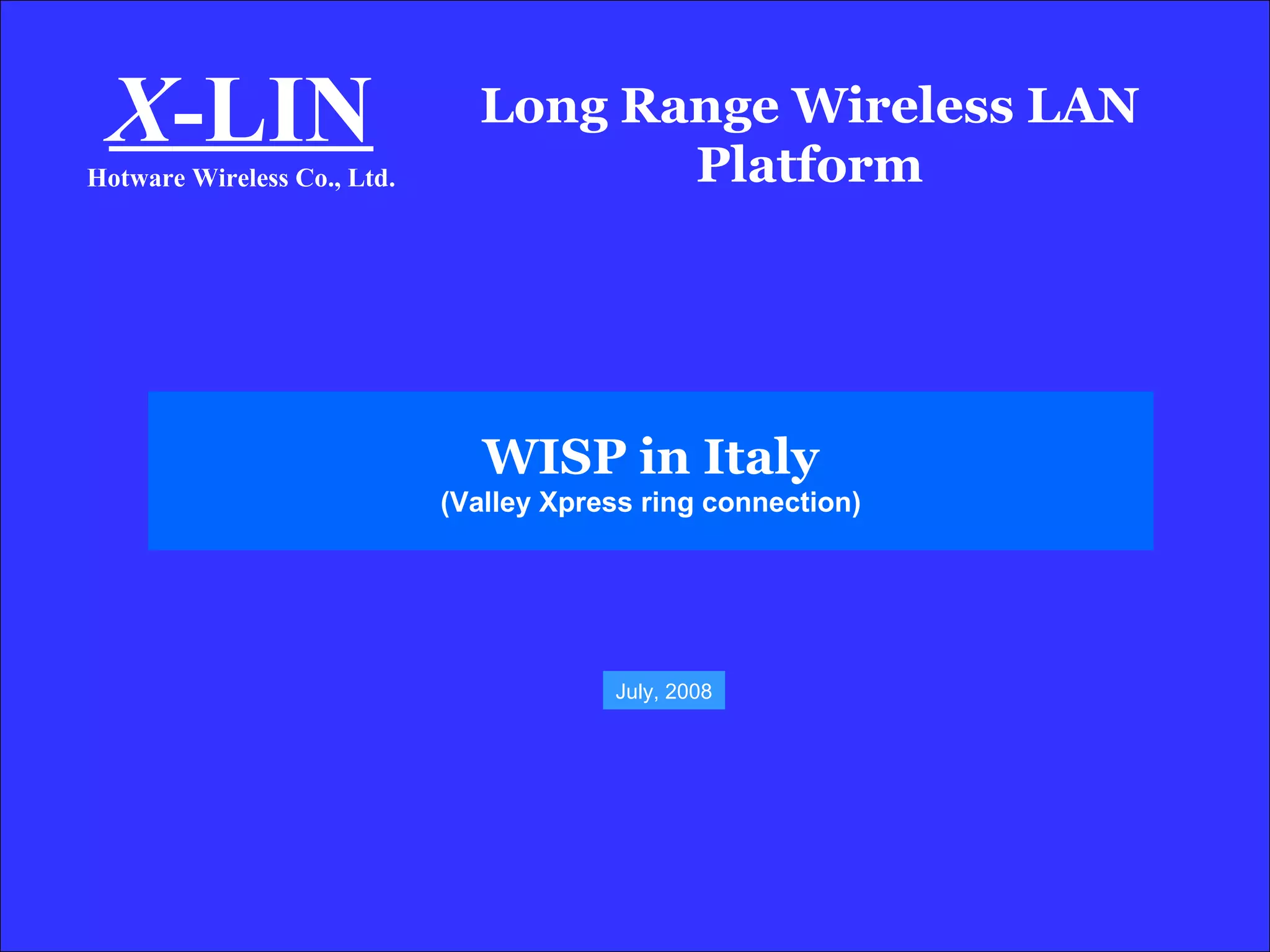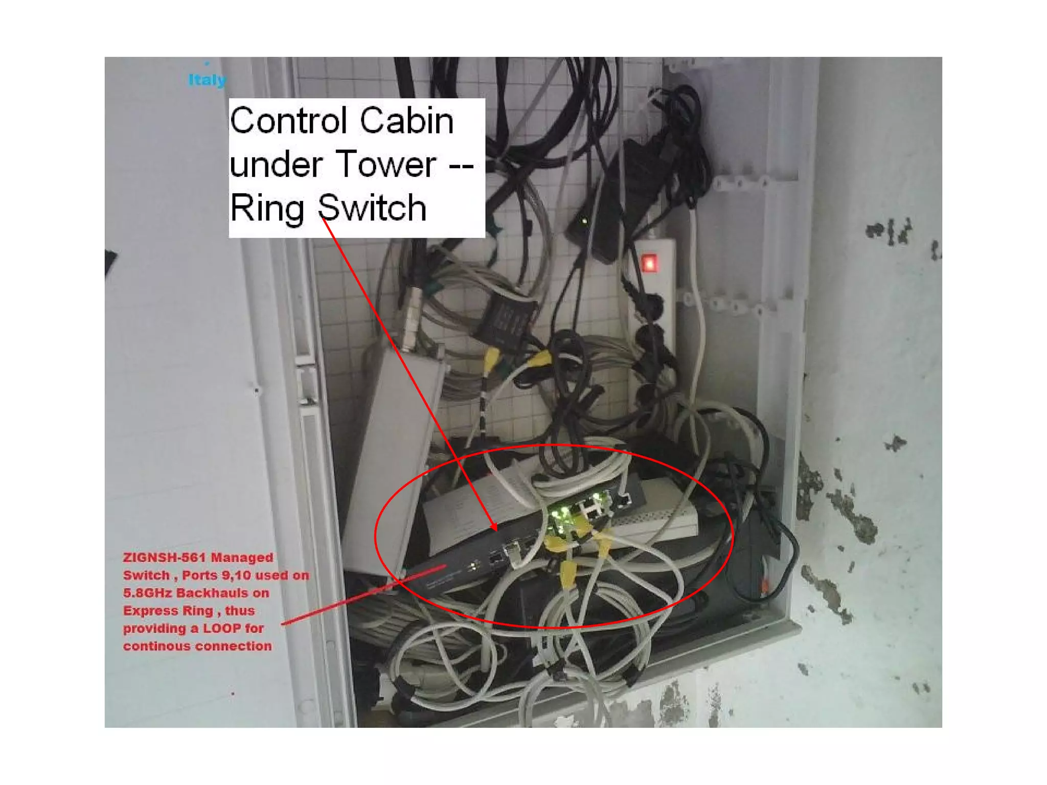 The document describes a wireless network setup in a rural area in Italy consisting of the following key elements: