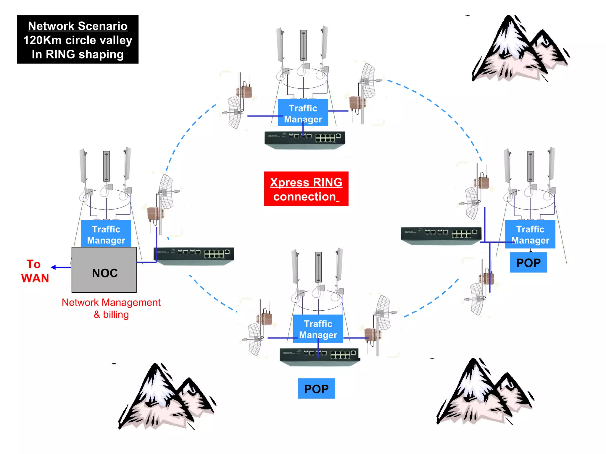 1. A ring network topology with traffic managers and switches to efficiently route data between access points (APs) and a network operations center (NOC) then to the wide area network (WAN).