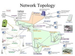 The document discusses Long Range Wireless LAN Platform X-LIN from Hotware Wireless Co., Ltd. It provides an overview of the network topology, billing and bandwidth management systems, and managed system switches. It also describes various wireless products available including outdoor CPE units, backhaul systems, access points, and MESH networking solutions for establishing wireless networks.