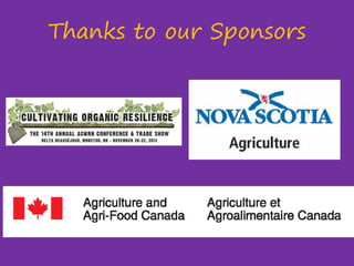 Richard Wiswall gave a presentation on farm budgeting at the ACORN Conference in Moncton, New Brunswick. He emphasized that profit equals income minus expenses, and provided lessons on scrutinizing big expenses like labor, efficiencies of scale, and having a cushion for overhead costs and bad years. Wiswall also discussed keeping budgets simple by focusing on key parameters and targets. He provided examples of budgeting for egg production from 50 layers and meat production from 50 birds to demonstrate the process.