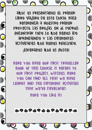 The document describes a project done by students called "Witches". It includes a traveler's book created by the students about what they have learned during the project. Some of the activities described include learning about how witches dress, what they eat, what transportation they use like brooms, what pets they have like black cats, and creating their own potion. The project helped students learn many things about witches through creative hands-on activities.