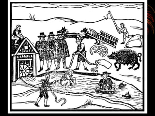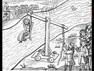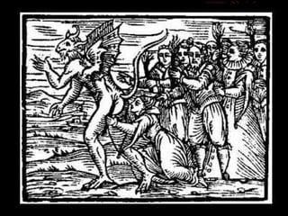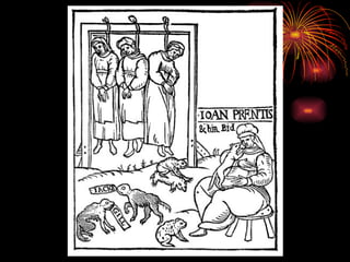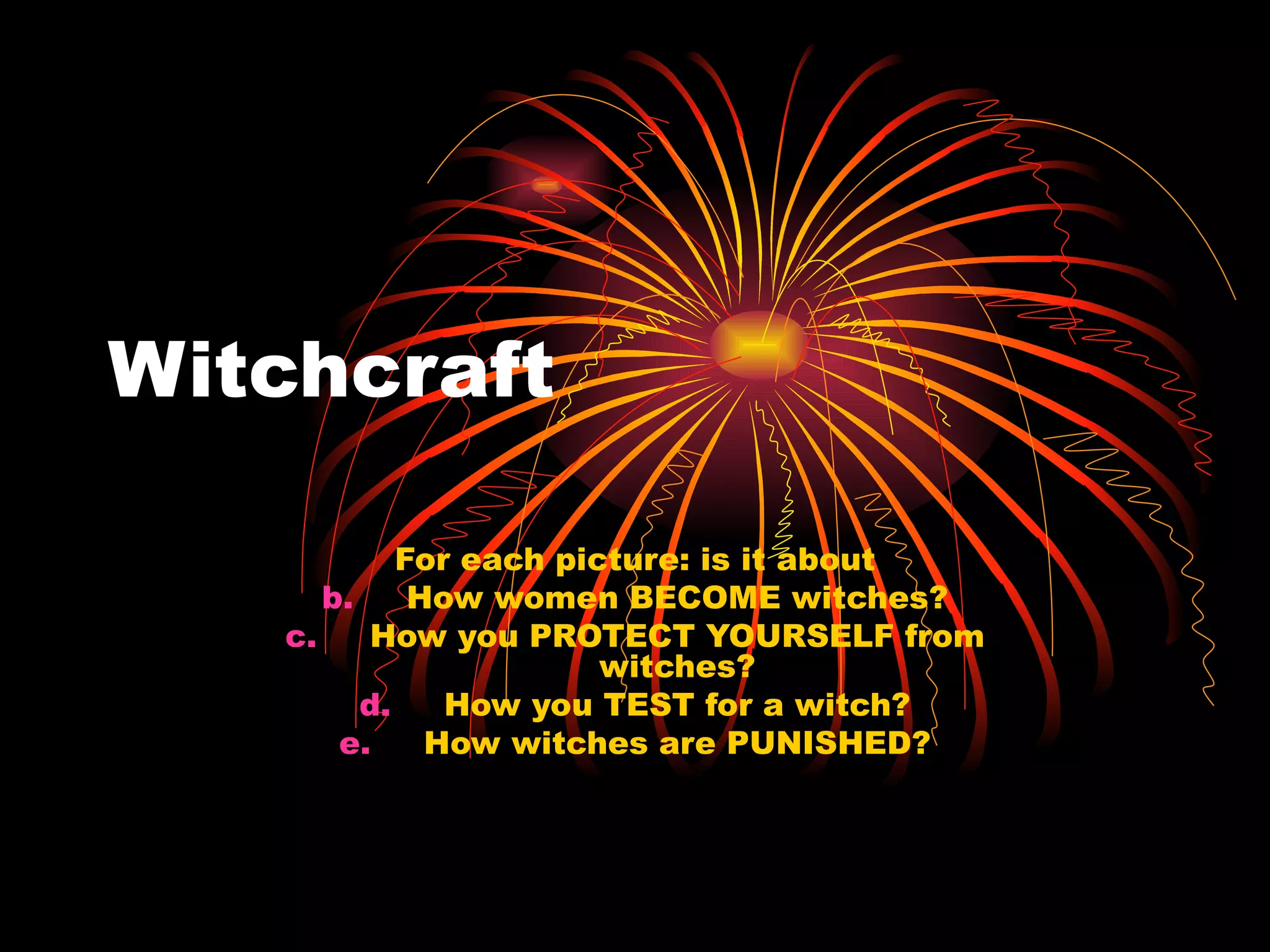 The document discusses different types of pictures related to witches, specifically asking if each picture is about how women become witches, how to protect yourself from witches, how to test for a witch, or how witches are punished.