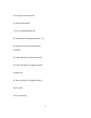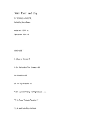 This document is a summary of a collection of poems by William A. Quayle about nature. It describes the table of contents which lists 22 poems with titles related to nature such as "A Gust of Wonder", "On the Banks of the Delaware", and "Dandelions". The summary then provides a brief excerpt from the first poem "A Gust of Wonder" where the narrator describes driving through the countryside in June and coming across a surprising sight of dwarf prairie roses blooming among red clover.
