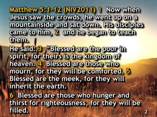 This document is a sermon that analyzes and discusses the fourth beatitude from the Sermon on the Mount: "Blessed are those who hunger and thirst for righteousness, for they will be filled." The sermon examines what it means to hunger and thirst for righteousness, how one develops this desire, and what those with this hunger should do until they are satisfied. It uses examples from scripture and discusses how righteousness is an "acquired taste" that begins by claiming Christ's righteousness through faith.