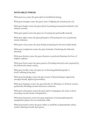 The document discusses how great power comes with great responsibility. It states that with abilities like strength, speed, sight, voice, wealth, knowledge, and power, comes the responsibility to use them to help those in need, spread beauty and justice in the world, and protect the planet as intended by God. Overall, the message is that those with advantages have a duty to uplift and support humanity.