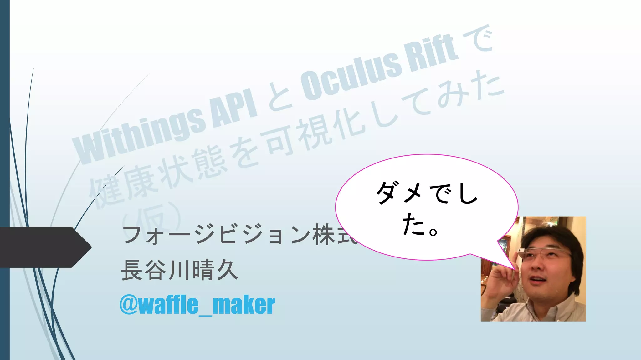 ダメでした。 代わりにOculus Riftの紹介をしました。 API Meetup Tokyo #5 〜新春LT大会〜 http://api-meetup.doorkeeper.jp/events/19430