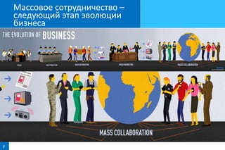 Документ обсуждает краудсорсинг как технологию, позволяющую использовать потенциальные знания и опыт больших групп людей для решения различных задач в бизнесе и обществе. Приводятся примеры успешного применения краудсорсинга в России, включая оптимизацию бизнес-процессов и общественную экспертизу. Также рассматриваются преимущества и недостатки этой технологии, а также ее влияние на инновации и развитие компаний.