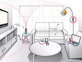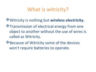 The document discusses wireless electricity or witricity. It explains that witricity involves the transmission of electrical energy from one object to another without wires. This is achieved through resonant magnetic coupling between a power source and receiver. The power source and receiver contain specially designed magnetic resonators that efficiently transfer power over mid-range distances through magnetic near fields in a safe, non-radiative manner. Potential applications include wireless charging of mobile electronics, electric vehicles, medical devices, and more.