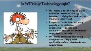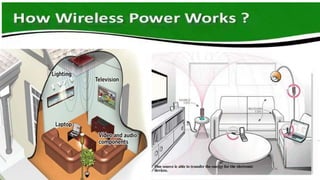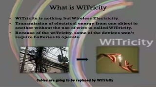 Nikola Tesla proposed wireless power transmission in 1899 using a radiative method that wasted much of the power. In 2007, six MIT scientists were able to transmit power to a light bulb within 2 meters at 9.9 MHz using a nonradiative mutual induction method. Witricity works through mutual induction and has applications for consumer electronics, industries, transportation, military uses, and medical devices.